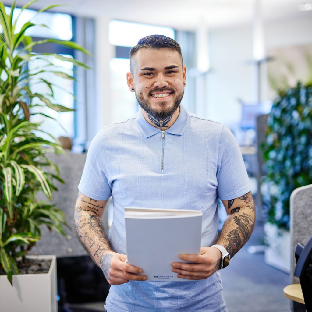 In der Gestalterbank kennt man Samuel Rac als aufgeschlossenen, freundlichen und sehr höflichen Kollegen. Das macht den Umgang mit ihm sehr angenehm – davon profitieren vor allem seine Teamkolleginnen und -kollegen aus dem KundenCenter der Volksbank eG – Die Gestalterbank. Denn hier ist Samuel seit zwei Jahren tätig. Im täglichen Kundenkontakt blüht der 28-jährige regelrecht auf. „Ich gehe immer positiv in ein Kundengespräch“ – und davon hat Samuel ganz schön viele. Bis zu 80 Kundinnen und Kunden berät er jeden Tag im KundenCenter.